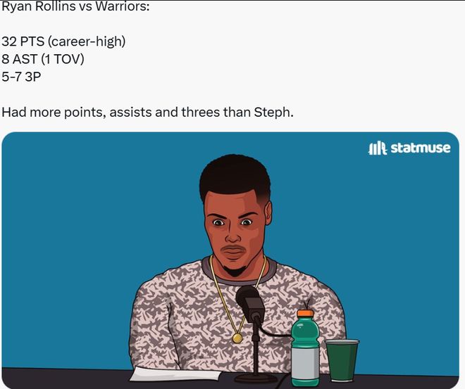 在本场比赛中,勇士旧将罗林斯发挥神勇,他首发登场36分钟,21投13中,其中三分7中5,另外罚球3中1,砍下32分3篮板8助攻,其中得分连续第二场刷新生涯纪录(上一场25分)。